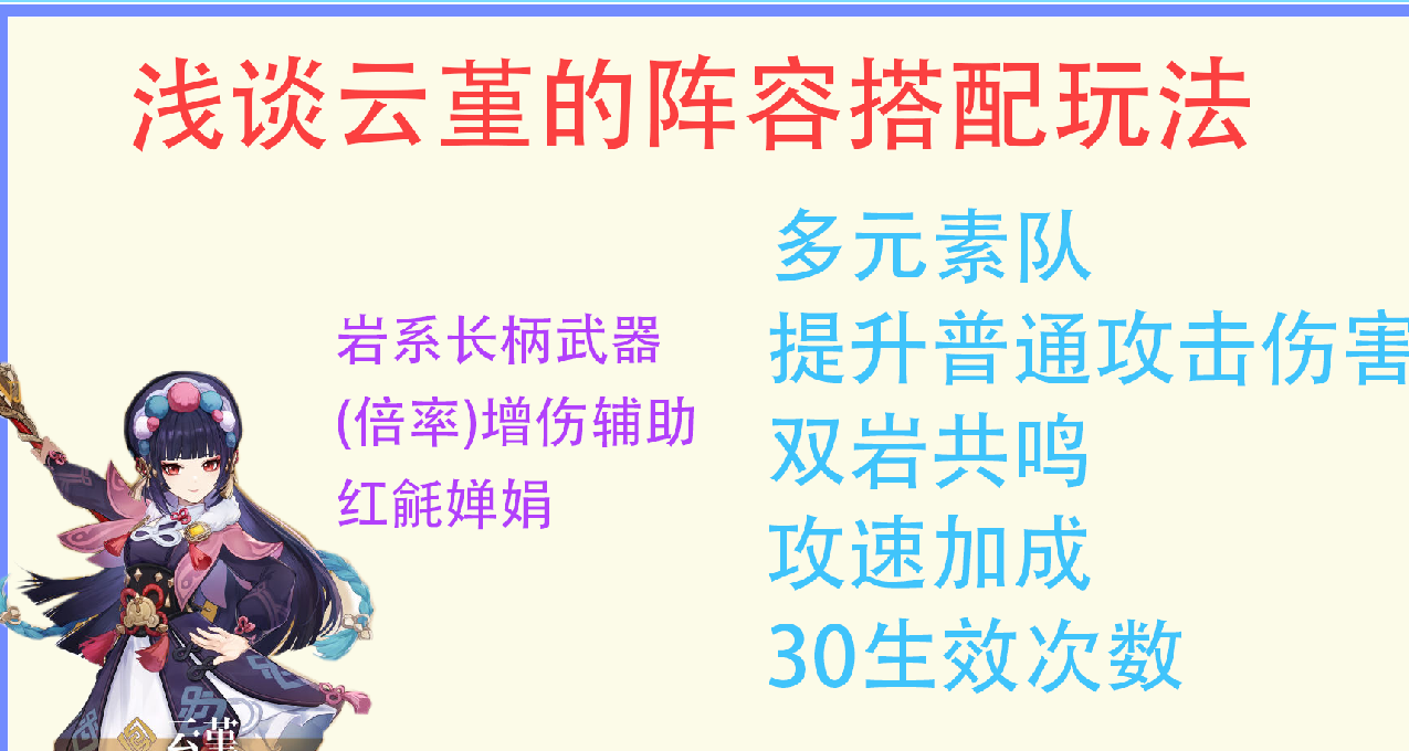 作为中国文化输出的一环,米哈游在云堇这个角色伤还是花了不少功夫的,云堇在国内外都有着很高的人气。但作为一个四星角色,角色塑造方面下的成本够多了,强度方面相应的就会被限制。云堇的配队不尽人意,很难取代掉现有的一些阵容体系。但对于手上角色不多的一些玩家,加入云堇后,可以替换出部分角色,使得深渊另一队更好搭配。本篇攻略就云堇的阵容搭配问题稍微展开一下,帮云先生解决一下就业问题吧!