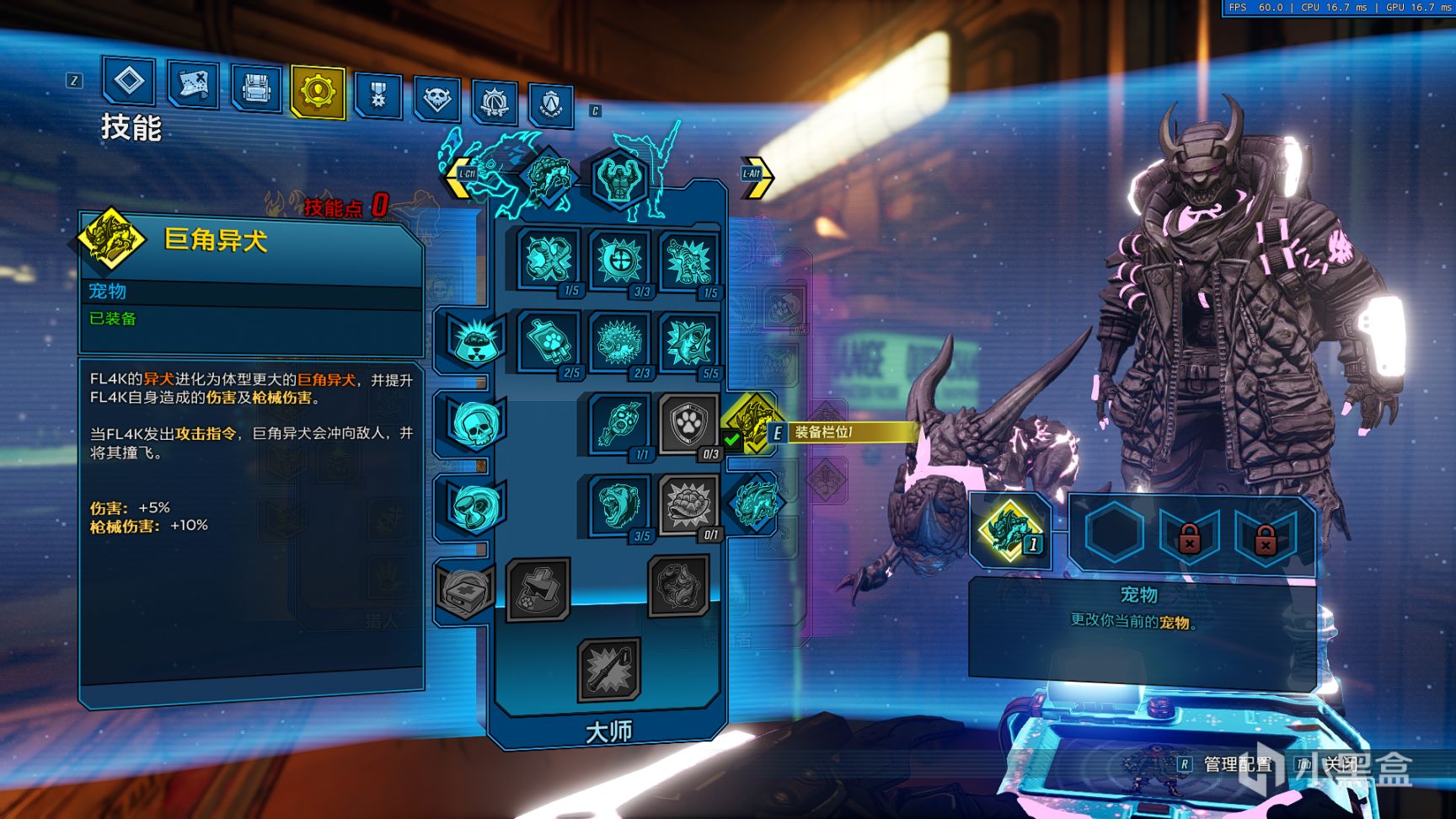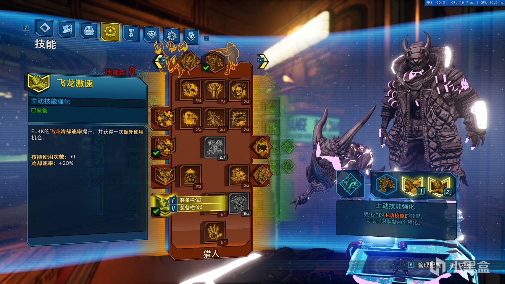 技能选择,主动技能为飞龙出击,插件为放鹰者的盛宴与飞龙激速,宠物为巨角异犬;