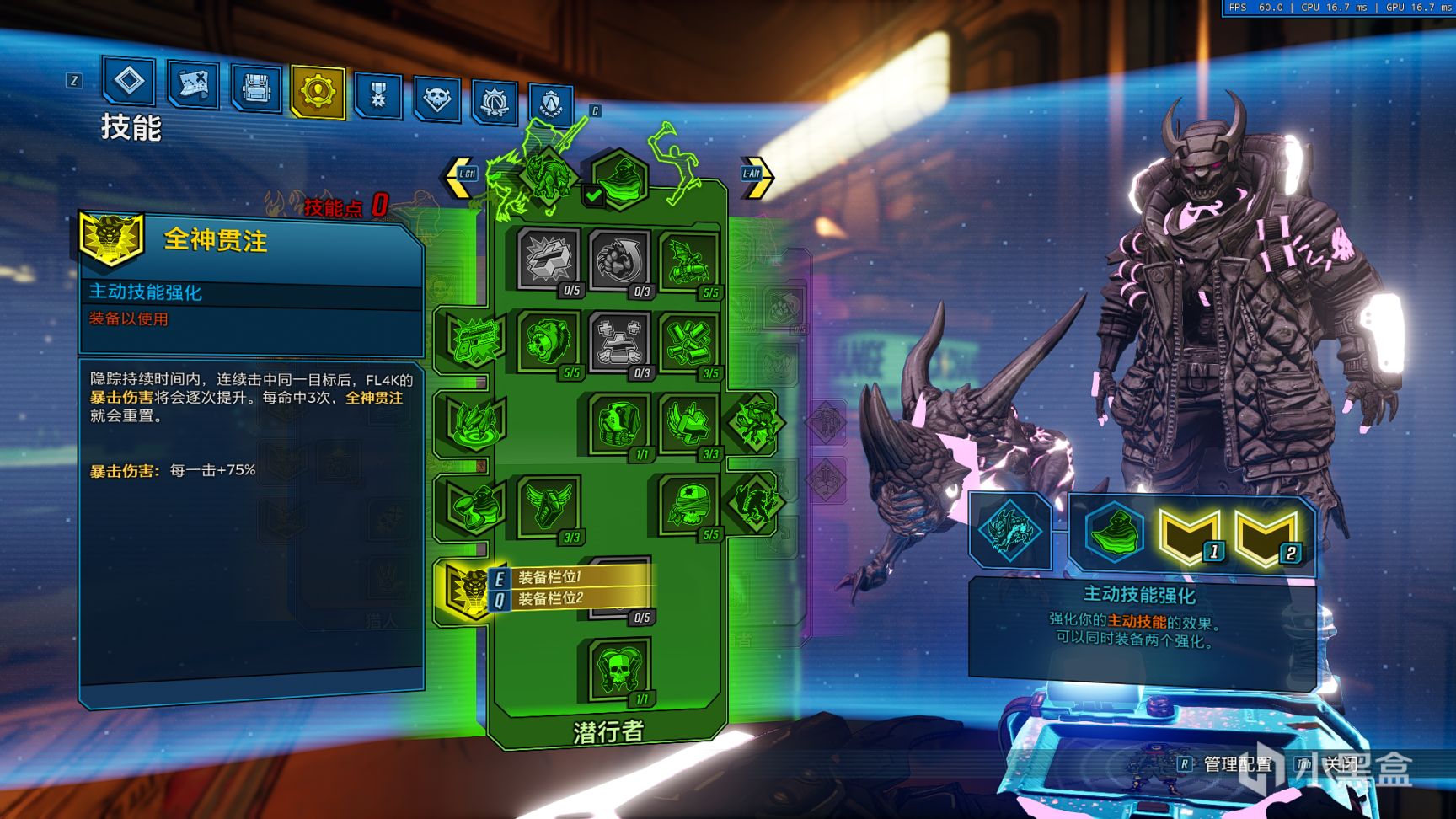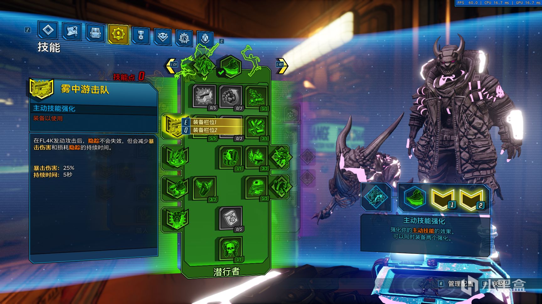 技能选择,主动技能为隐踪,插件为雾中游击队和全神贯注;