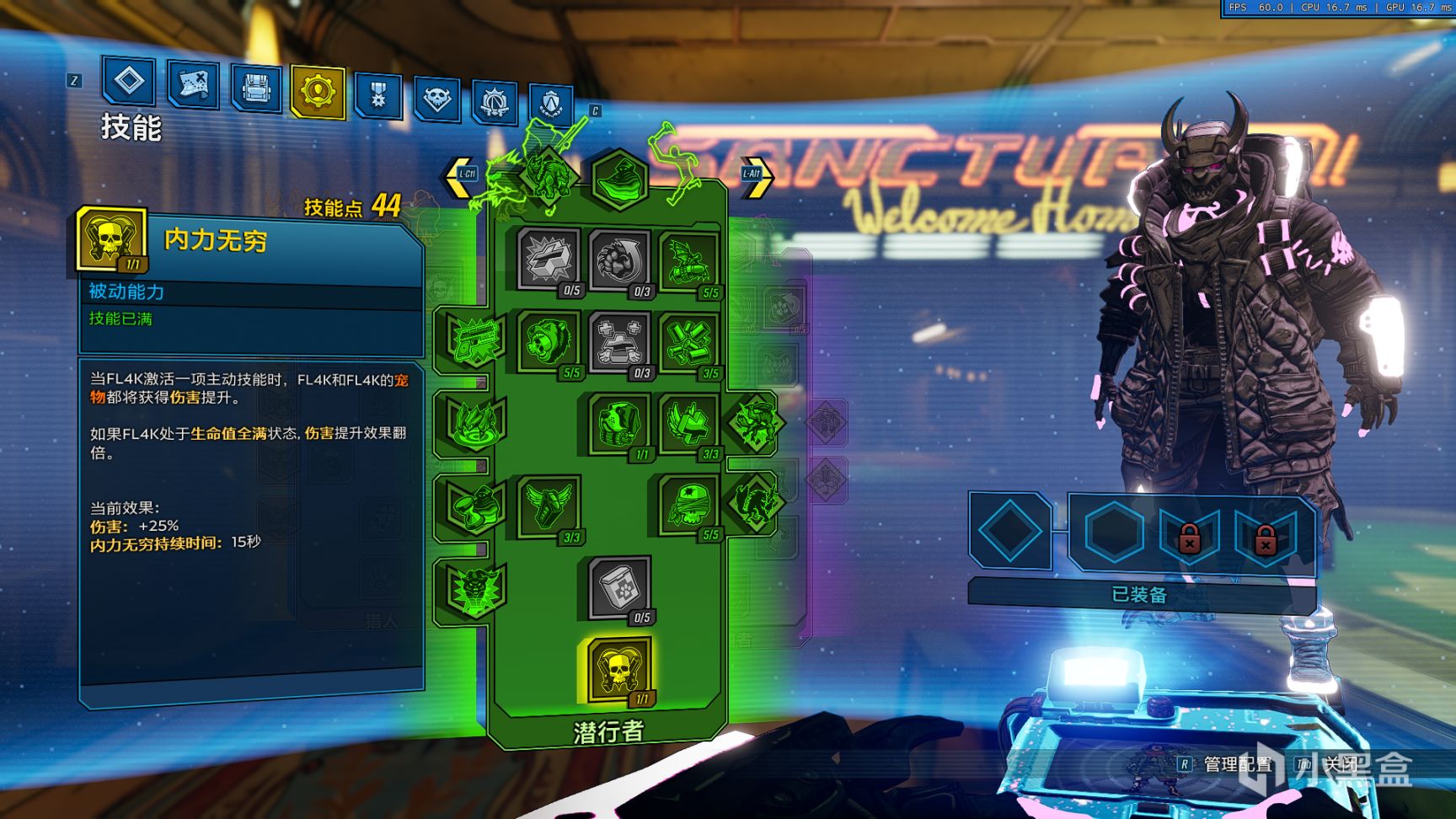 装备:你喜欢的带有”在主动技能失效后接下来xxxxxx”受福词条的武器装备,建议为面板较高/手感较好的武器,如超等离子线圈、O.P.Q系列步枪、瘟疫传播者等