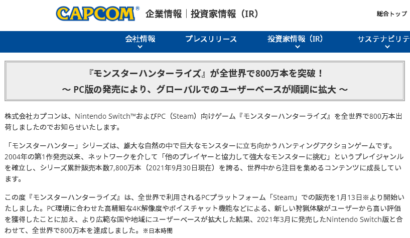 卡普空宣布《怪物猎人 崛起》全球出货量已超800万份。