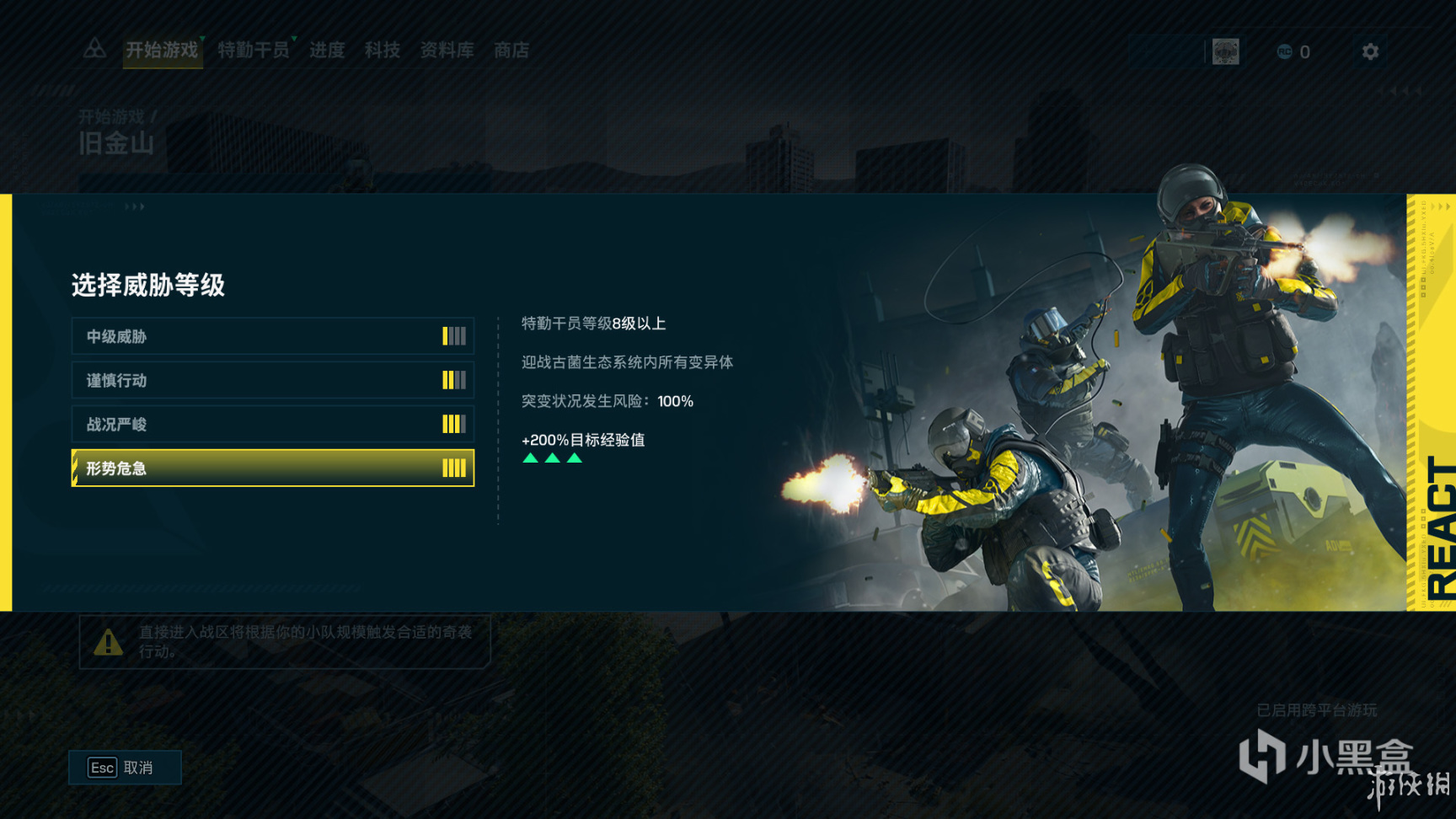 当然在这种循环式玩法下只有一种游玩难度是不太可能的,在R6E中共有四种难度供玩家选择,由低至高分别为:中级威胁(简单)、谨慎行动(普通)、战况严峻(困难)以及形势危急(专家)。每一个威胁等级都将在达成指定REACT里程碑时解锁并带来更多种类古菌的对抗以及更大的挑战,当然对应奖励也更为丰厚,另外单人模式与小队模式也存在着一定的难度差异,例如单人模式开局干员多50点强化生命,古菌数量相对较少,气闸舱(安全屋?)内的补给也更丰富。