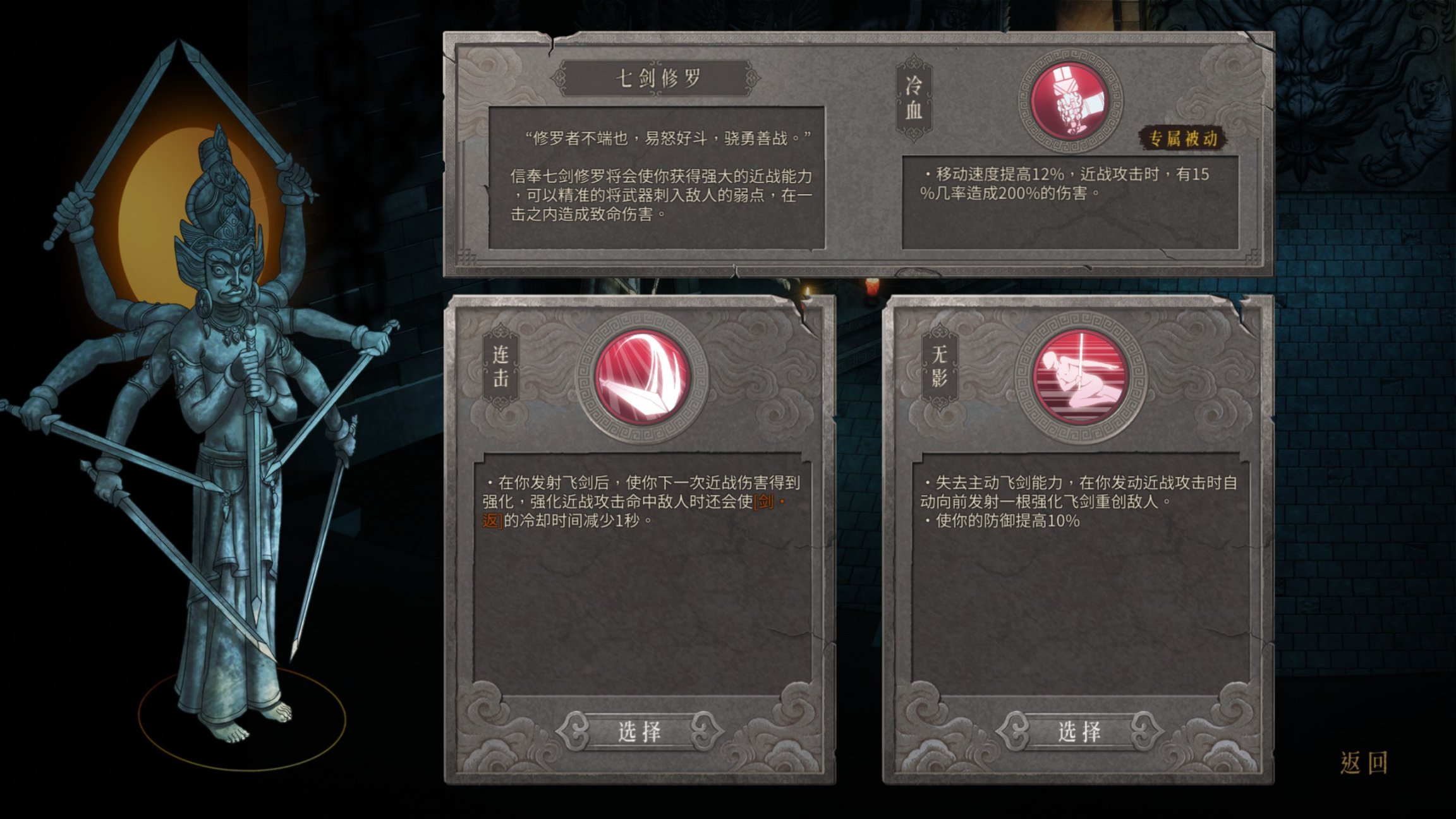 在最开始膜拜七剑修罗神像后的你拥有7把飞剑,可以选择发射飞剑后增强下次普攻或是舍弃飞剑在近战攻击敌人时射出一把飞剑,而后续的宗派技能将会针对这两项以及双倍伤害的被动进行增强。