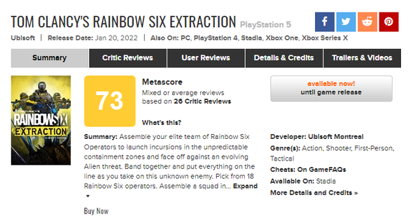 育碧旗下「汤姆克兰西」系列最新射击游戏《彩虹六号:异种》正式发售,全球各大媒体均公开了本作的评价情报。目前在Metacritic站上已有26家媒体进行评价,均分73分表现尚可。