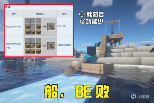 1、合成表不同;以玩家常使用的船为例,在BE中,似乎为显得合理性,特意合成材料栏目中比JE多出了一把木铲,用以充当船桨。