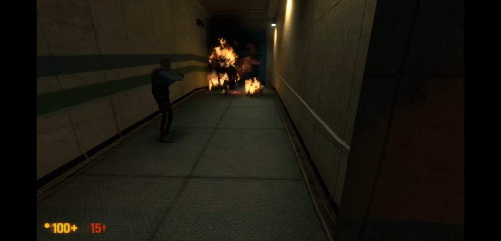 可以去的房间更多了,他们会对戈登的到来做出反应,或者就像是真正的科学家那样聚在一起探讨学术问题,十分深奥且乏味。去更衣室穿上HEV吧,一进门就是一个科学家说出那句经典的“为什么我们要打这可笑的领带呢”。按下按钮,穿上HEV,播放摇滚乐,不过不是原版的那首曲子有点失望。刚才那个打领带的科学家看到戈登的HEV就会讲述起自己曾经穿着旧版HEV的时光,并且吐槽了一下戈登不戴头盔和HEV没有水下呼吸系统。