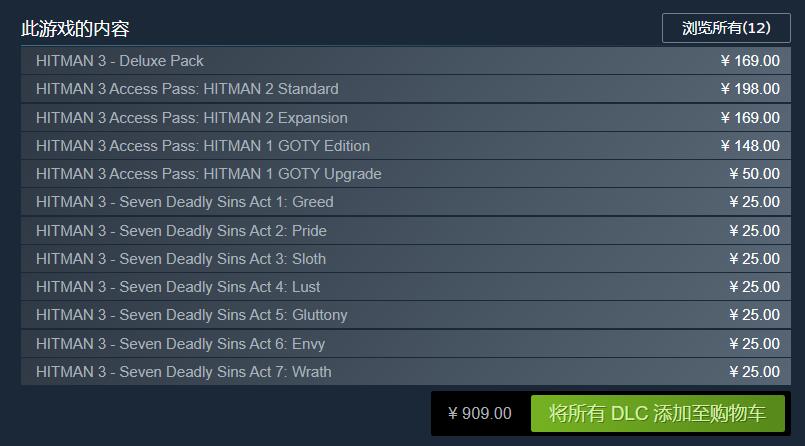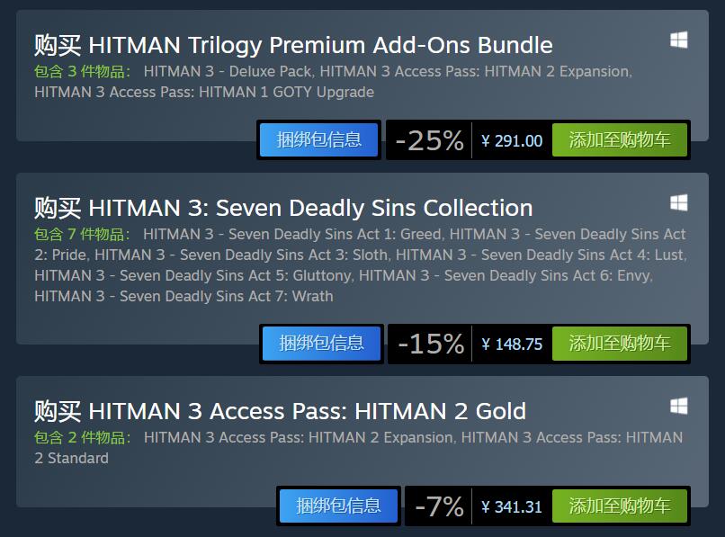 大型沙盒潜心游戏《杀手3》今日已正式登陆Steam平台!Steam版包括标准版(274元)、豪华版(418元)、七宗罪合集捆绑包(148.75元)、三部曲捆绑包(469元)、三部曲DLC捆绑包(291元)、1代GOTY升级包、2代拓展升级包等所有内容,且七宗罪各章节也可单独购买。游戏支持中文。