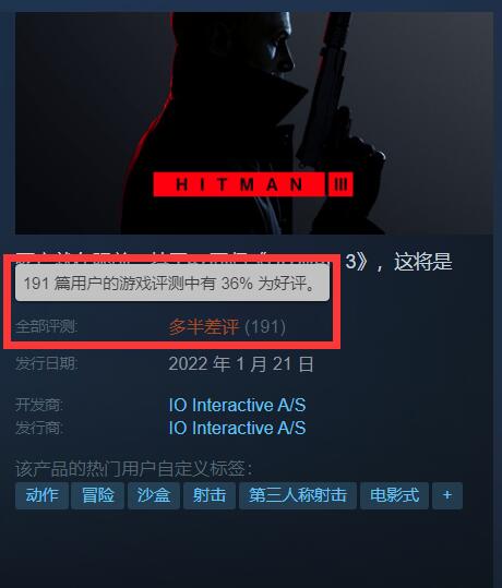 不过,目前《杀手3》Steam好评率仅为36%“多半差评”,除了对Epic独占一年不满外,玩家主要指出以下几点问题: