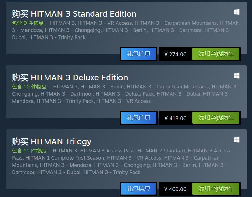 3,游戏版本分得太多,内容介绍却不清楚,很容易搞混;杀手1/杀手2老玩家无需重复购买、绑定IOI账号就能获得1/2代内容,但商店页面却看不到这些信息。