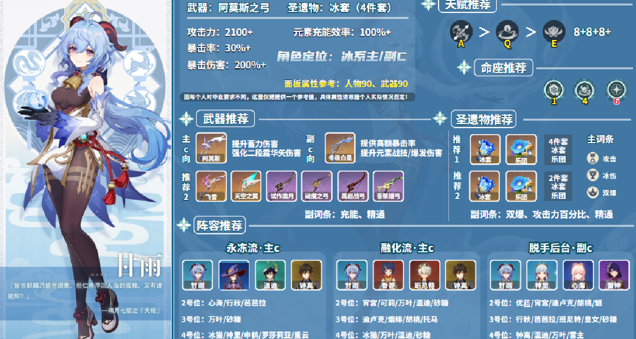 1. 甘雨目前有两个主要的玩法:永冻流、融化流,永冻流安稳舒适,融化流伤害上限高。