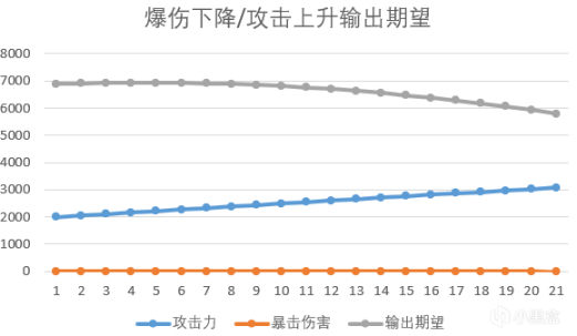 从图中我们可以看出,在攻击力为2000时,前六个攻击力词条和爆伤词条基本等价,随后攻击力的价值急剧下降。