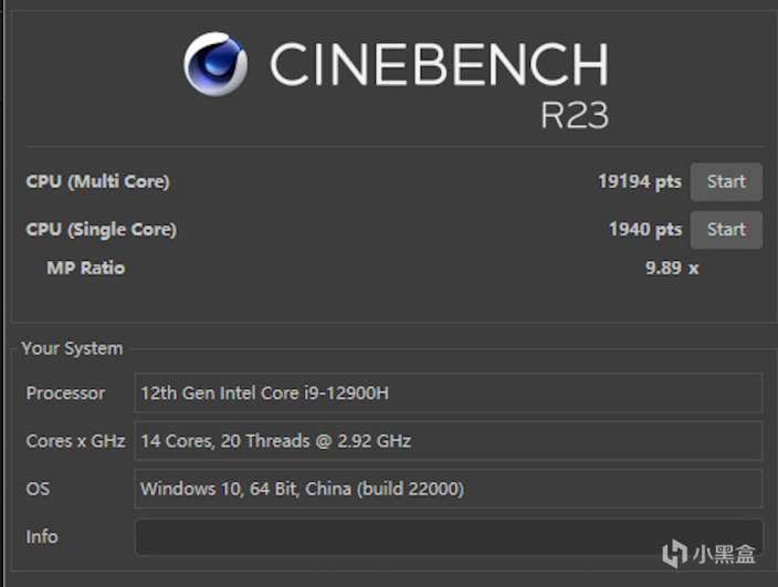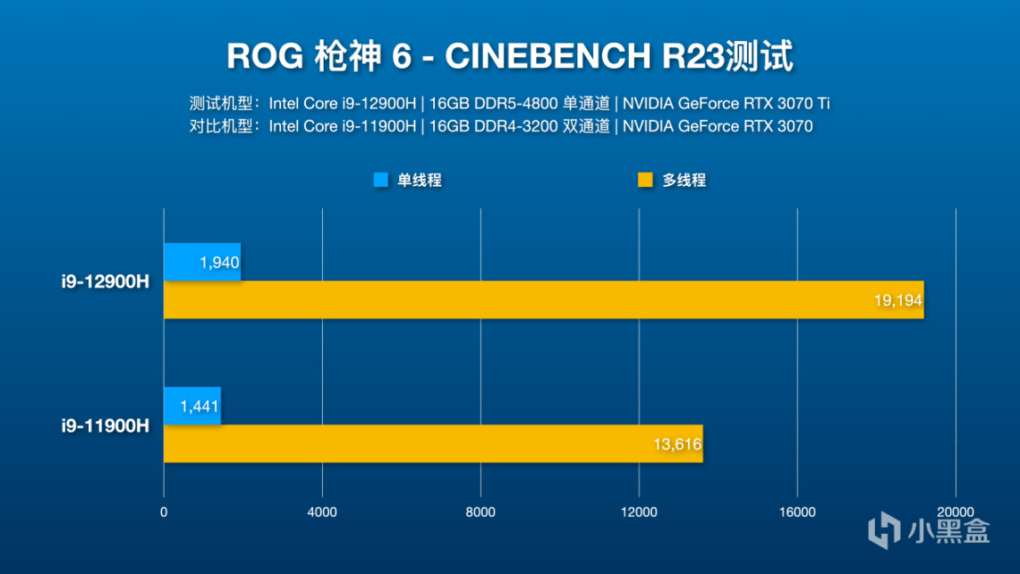 CINEBENCH R23项目测试,ROG枪神6跑出了单核1940多核19194的高分,哪怕在原机单通道内存的情况下,相比起上一代i9-11900H,单线程提升了35%、多线程提升了40%,这个性能提升作为一代之隔的两款CPU来说提升幅度十分巨大。