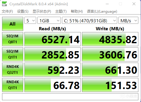 原机自带的硬盘来自于镁光,是一块PCIe 4.0的高速SSD,实测读取6527MB/s,写入4835MB/s,性能上毫无短板。无线网卡在第一个硬盘下方,支持WiFi 6E。此外,下方还提供了第二个M.2插槽,同样支持扩展PCIe 4.0硬盘。