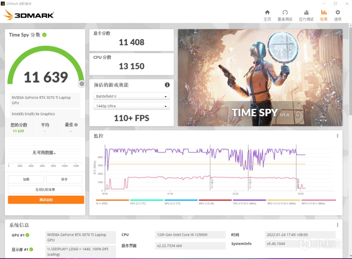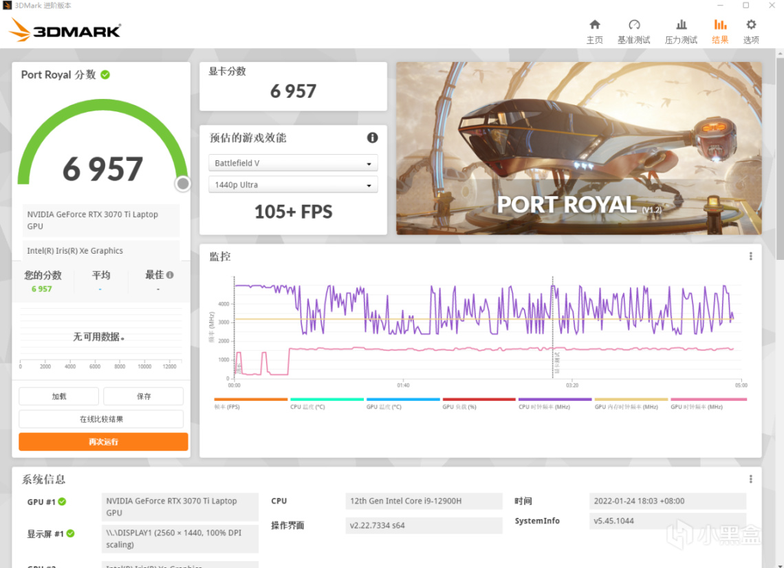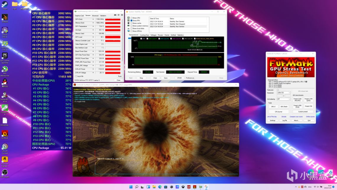 AIDI64+FuMark双烤测试当中,系统稳定后可以看到CPU部分大核维持在3.1GHz频率,小核维持在2.4GHz,整体功耗55W,温度仅为77℃;GPU部分可以维持在1100MHz以上的频率,功耗跑满125W,而温度也只有73℃。面对12代i9和RTX 3070 Ti这两个发热大户,ROG枪神6在这个体积下有这样的散热表现非常让人惊讶,这个散热成绩也可能是12代U游戏本中的顶级水准了。