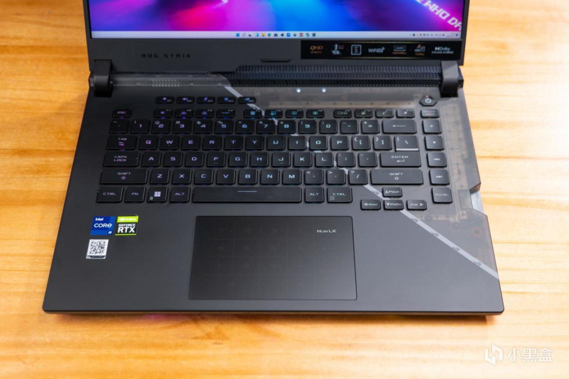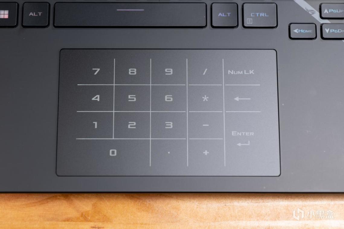 ROG 枪神6的键盘虽然不带数字键区域,但可以通过长按触摸板右上角,点亮后可以让触摸板变成一个数字小键盘。