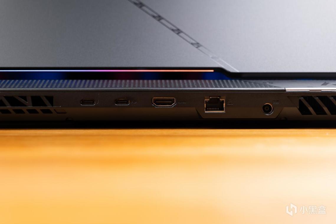 机身左侧提供了2个USB 3.2 Gen 1接口,其余接口在机身后部,提供了2个USB-C、HDMI 2.1和RJ45网线接口。