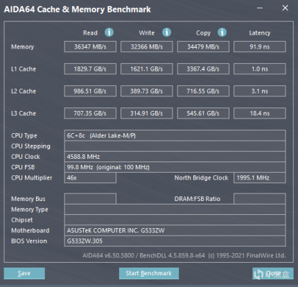 随着12代酷睿一同而来的就是DDR5内存,这也是笔记本平台最早一批用上DDR5内存的产品。不过稍显可惜的是,我们这台测试机使用的是16GB DDR5-4800规格的单通道内存,实测读写速度在36346MB/s和32366MB/s。如果自行升级到双通道后还会有翻倍的速度提升,读取速度翻倍到了66340MB/s,写入速度翻倍到了64978MB/s。相比起DDR4时代,性能有着巨大提升。