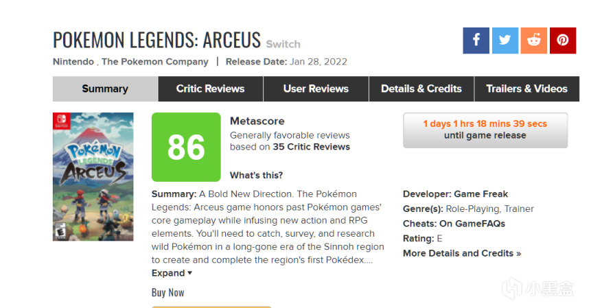 《宝可梦传说:阿尔宙斯》MC网站首批媒体均分已出,截止本文发出,已有35家媒体给出评分,均分为86分。