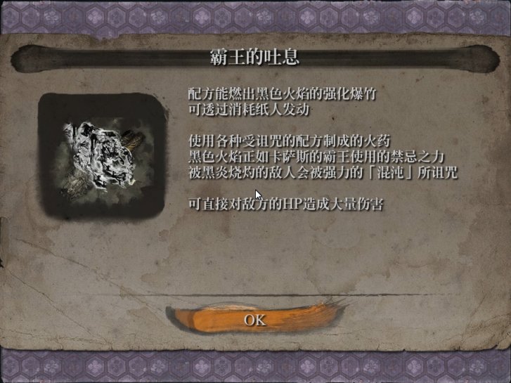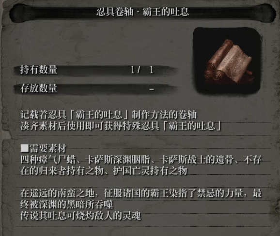 获取方式:霸王的吐息是三个新增忍义手中获得最为困难的,因为他的有一个原料需要我们战胜心中的一心,然而普通一心就非常厉害了。