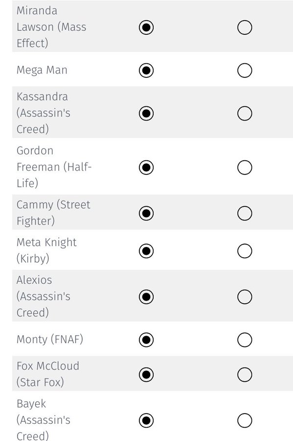 许多游戏角色也出现在列表中,像是《命运2》角色“萨瓦拉”以及“欧西里斯”,以及《质量效应》的主角男性和女性版的“指挥官薛帕德”都是潜在的联动角色。世嘉的《如龙》以及《怒之铁拳》也包括在内。