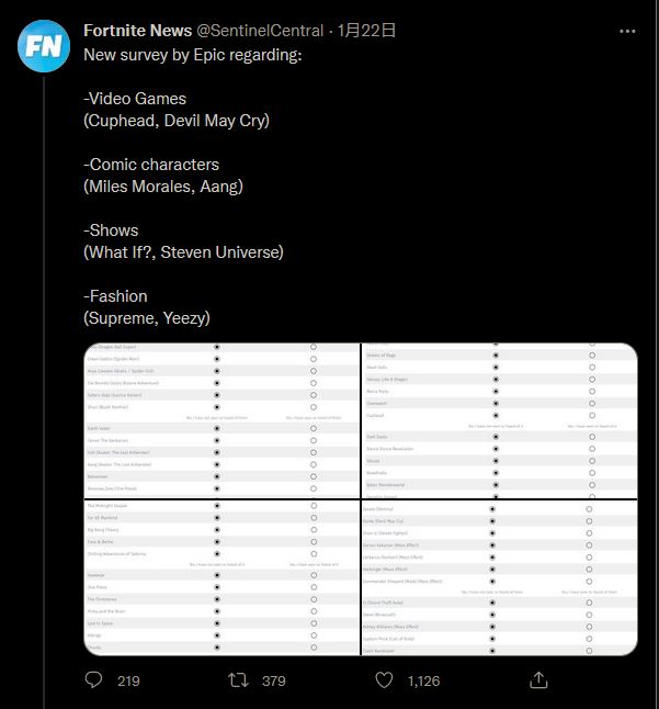 要注意的是,在问卷中出现的角色并不一定意味着联动。Epic Games 通常借由问卷调查某个 IP 的热门程度,以评测某个角色是否值得联动。