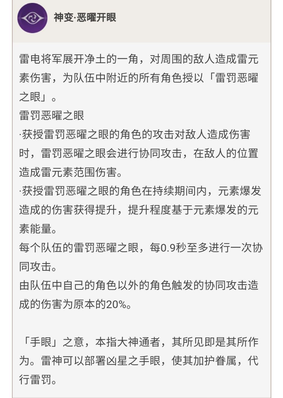 元素战技被动:雷罚恶曜之眼:提供雷属性协同攻击,目前游戏最特殊的机制,无范围限制(这个攻击在联机的时候是有范围限制的,以防万一说下)脱手自动攻击且后手上雷,但是面对抵挡伤害的元素盾(如深渊法师的盾)不触发。