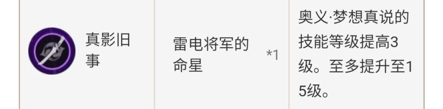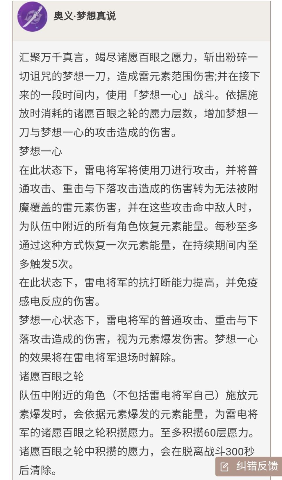 - 元素爆发:奥义·梦想真说,二次元居合(确信)高额爆发伤害,最高倍率1141%(爆发类大招除优菈外最高倍率)提供7s输出能力(在二命前这个伤害并不高,不推荐打满,雷国除外)并给全队回复能量,27.5(300%元素充能效率的情况下)这个能量回复必须10级才能吃满,建议升10级