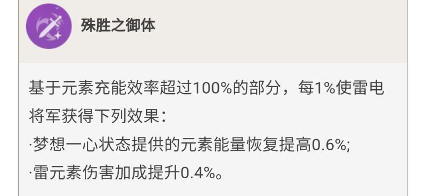 - 天赋二:殊胜之御体,核心天赋,将雷神整个技能体系串联起来,元素充能效率转换雷伤,降低对雷伤杯的需求,提高大招回复能量能力,也因此雷神在二命前可以先考虑将元素效率拉高(最佳值为300%,因为这是绝缘套的提升伤害上限),在拥有专武后,这个数值可以降低为270%(当然指的是精一)