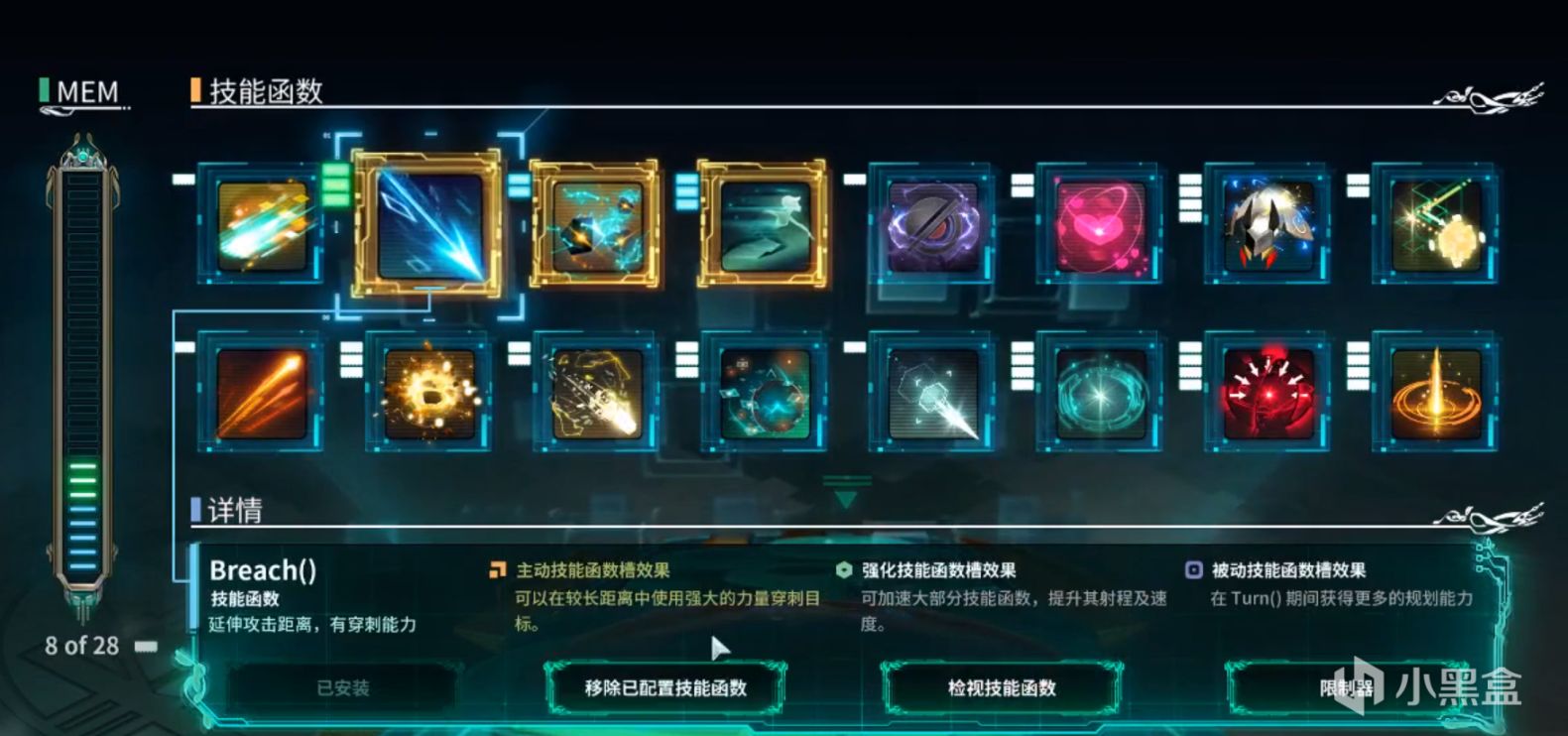 个人认为一款好的游戏除了精美的画风和引人入胜的剧情外,它的核心之一,即游戏玩法能在初见时让人眼前一亮是十分重要的,而该游戏的玩法部分我最直观的感受是“自由”,玩家可以通过各种有趣的技能来搭配特殊的攻击方式,两者相辅相成,相互交融。游戏中玩家一共有4个主动技能槽和4个被动技能槽,除开这些外,每个主动槽都带有两个强化槽来赋予这个技能新的效果,下面我来举个例子,方便大家理解 ,"点击技能Breach()可以发射一道激光并穿透敌人,但如果在强化槽中放入弹跳技能Bounch(),此时Breach()发出的激光就能在敌人之间来回跳转"。游戏中每个技能都有其单独的主动、被动和强化效果,而随着游戏进程的不断深入,可供玩家选择的技能也愈来愈多,这意味着技能搭配的自由度也在不断延伸。再就是该游戏特殊的攻击方式---子弹时间,玩家按下空格即可冻结时间,而每次移动都会消耗一定的能量,不断调整路线,对路线上的敌人放置技能并计算伤害,然后再次按下空格,人物就会在一瞬间执行你的所有指令。