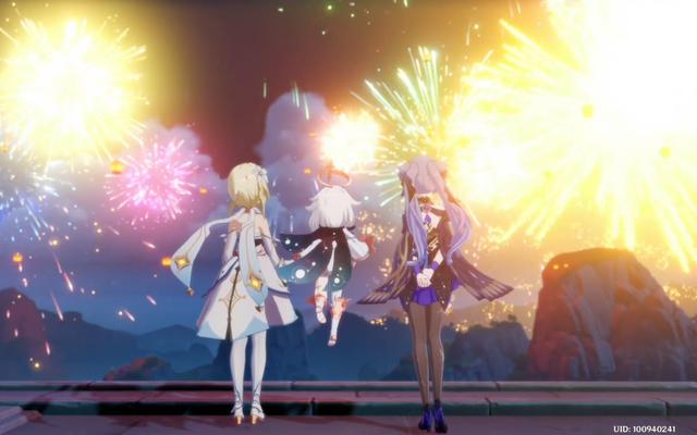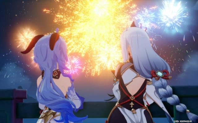 平时玩得比较好的几个角色也是各自在一起欣赏烟花,这里甘雨与申鹤的背影烟花图超美,胡桃与钟离有cp的感觉了。