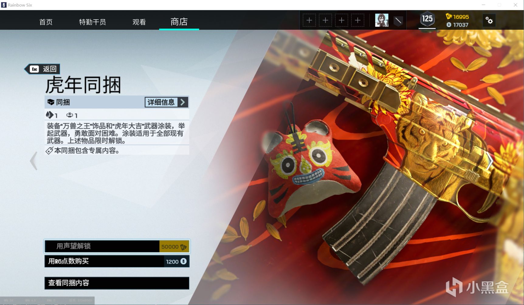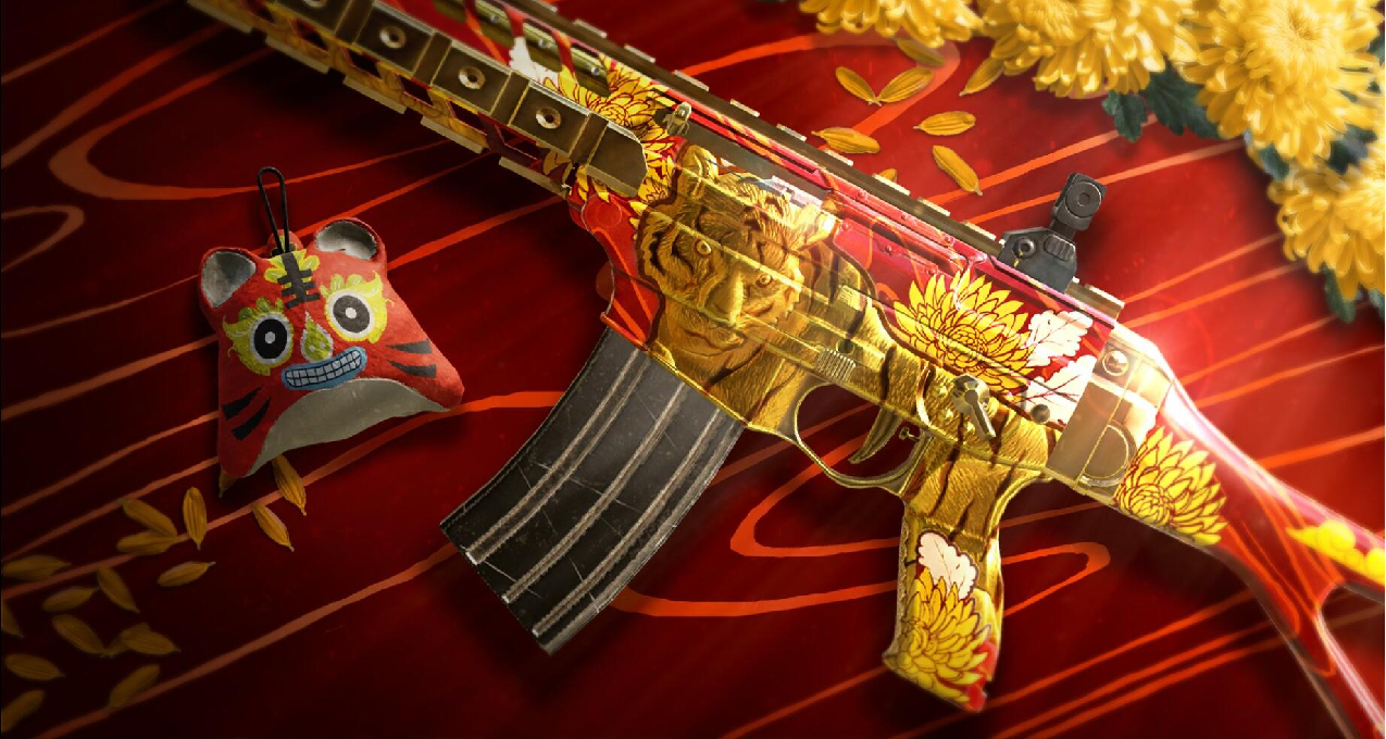 万众期待的虎年同捆来啦~包含通“万兽之王”饰品和“虎年大吉”武器涂装,今年主色调为金红,相当的NICE!解锁需要50000声望/1200R6点!
