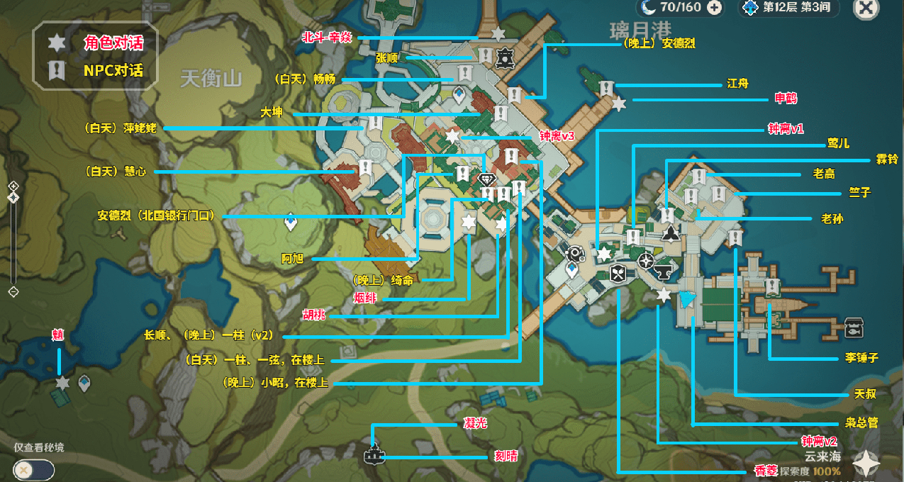 ▲有些NPC在白天出现,有些在晚上才出现,所以如果在标点位置没找到,就调下游戏时间;像钟离有3个对话,先把前面的对话完,就能触发后面的。