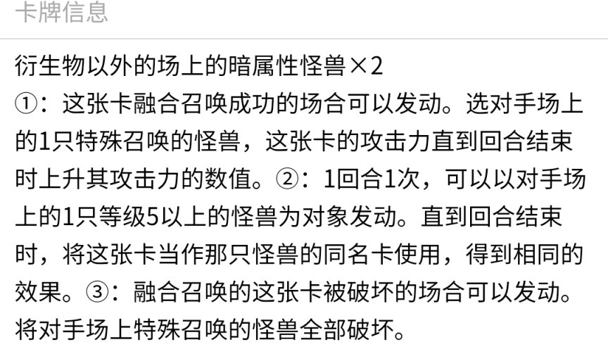 一般通过超融合来针对环境内暗属性怪兽较多的卡组,或者配合青锁龙森蚺来进行解场