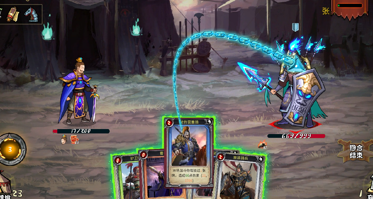 《三国:归途》以三国为题材,有不少增加代入感的设定。比如游戏中的战斗地点也是分类型的,击败地点上的敌人就算是占据了这个地点。除了前文提到的矿山,还有靶场、马场、兵营等,对应远程、骑兵、步兵三种兵种,玩家每占据三个相同的地点就能获得相应兵种的卡牌作为奖励。除此之外,还有城池类型的地点可以让玩家升级装备。随机事件由于不需要战斗,所以需要占据9个才能获得生命值的加成作为奖励。这种设定就将三国时代的攻城略地表现了出来,而不是像其他的DBG+RL游戏那样打完一个地点的战斗这个地点就没用了。这种设定一方面增加了策略性(玩家根据自己的需求来选择下一个地点),一方面也让玩家更有代入感了。