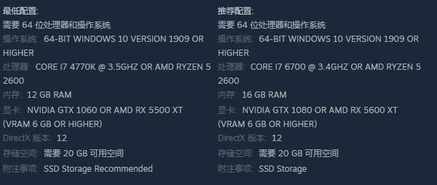 最低要求包括具有12GB RAM的Intel Core i7-4770K 3.5 Ghz或AMD Ryzen 5 2600,以及具有6GB VRAM或更高的Nvidia GeForce GTX 1060或AMD Radeon RX 5500 XT。推荐要求包括具有16GB RAM的Core i7-6700 3.4 Ghz或AMD Ryzen 5 2600,以及具有6 GB VRAM或更高的GTX 1080或RX 5600 XT。而存储空间需要20GB,并推荐使用固态硬盘。