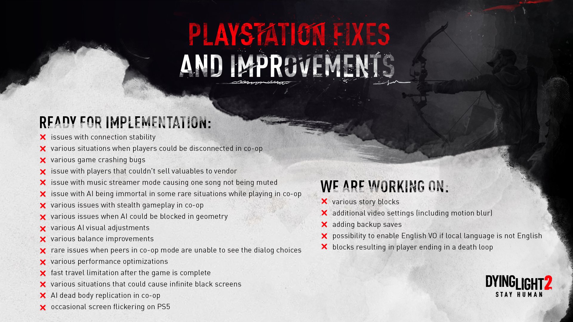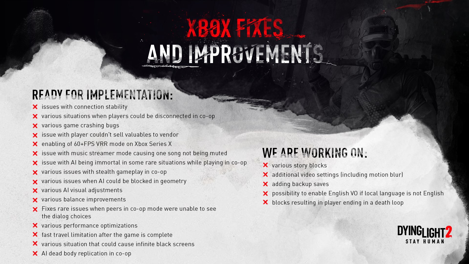 《消逝的光芒2》已经正式发售,今日官方公布了后续修复更新计划,他们在周末发布了一些补丁,之后未来几天会继续推出更多补丁。官方还为PC、PlayStation、Xbox三个平台分别公布了修复计划。