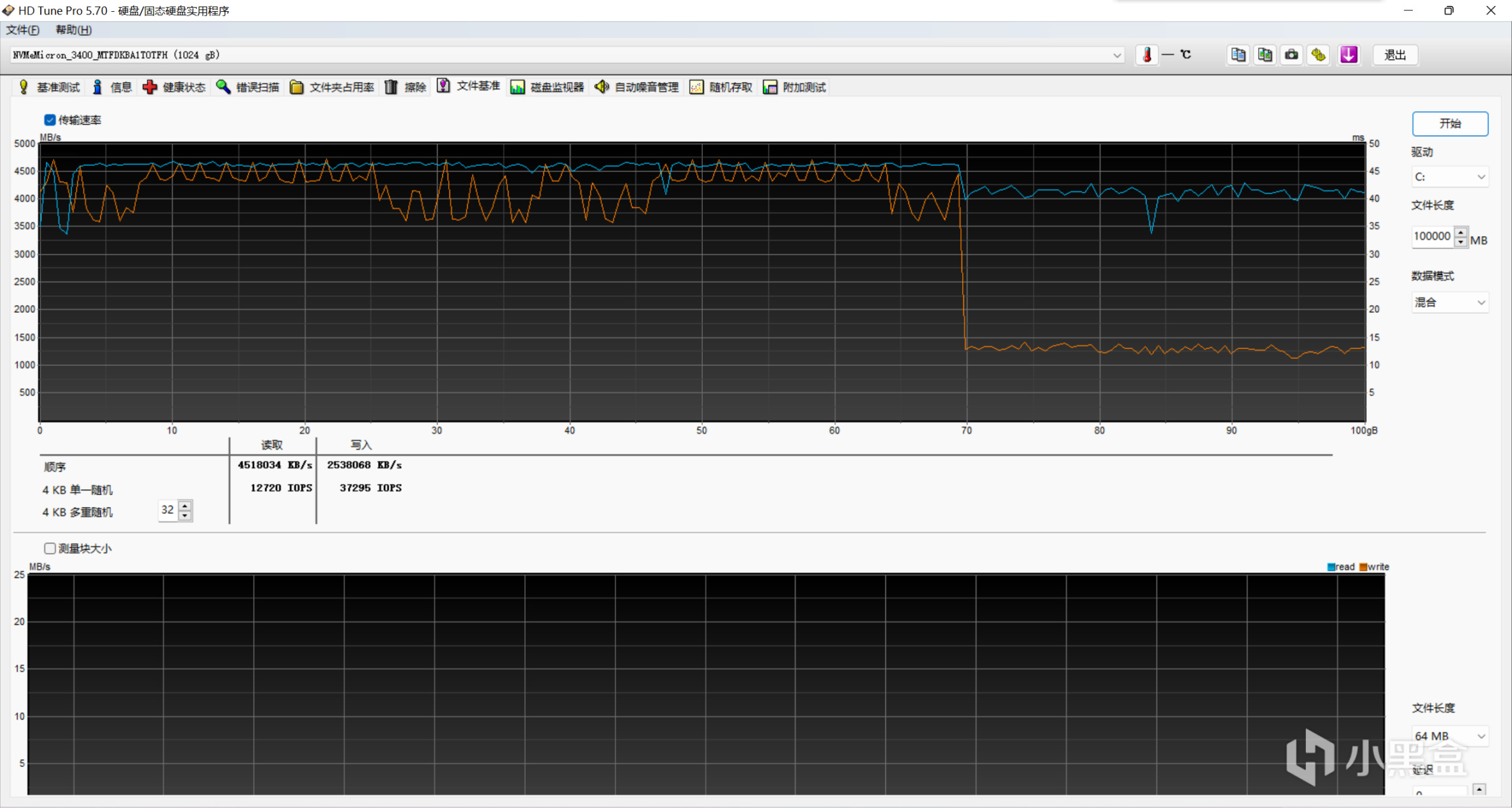 跑100G混合模式,70G才出缓存。缓外速度为1300MB/s,仍然足够使用。