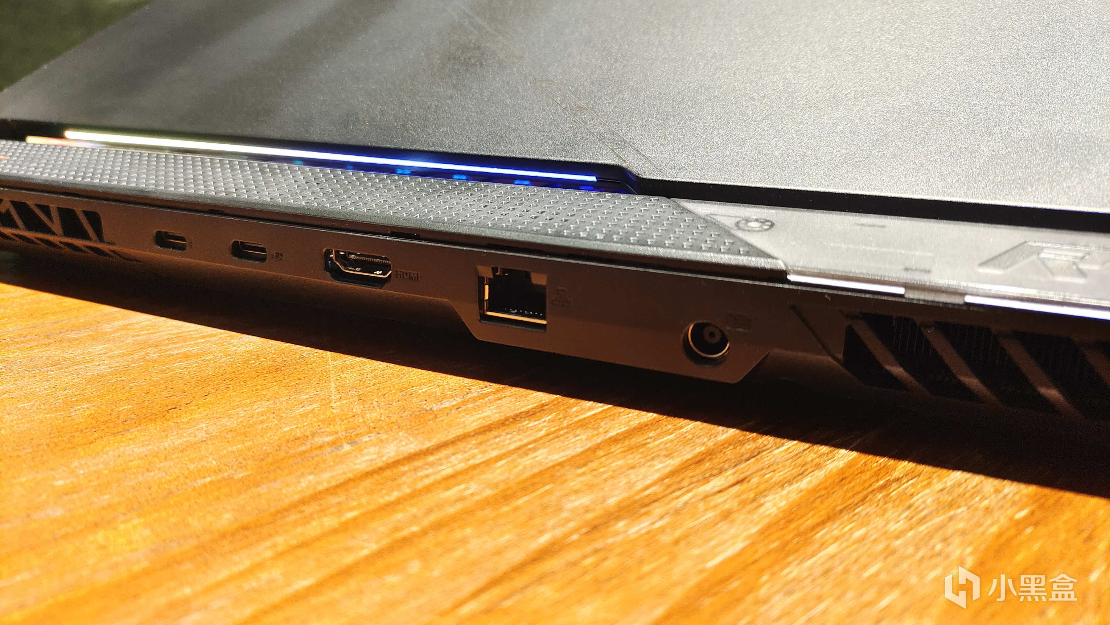 剩下的接口都在后面提供了两个USB-C(其中一个支持雷电,另外一个就是PD充电以及视频输出),还有一个HDMI2.1,一个RJ45,电源接口。