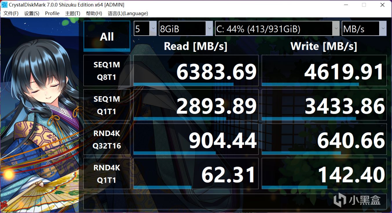 速度很不错,顺序读写为6383MB/s和4619MB/s