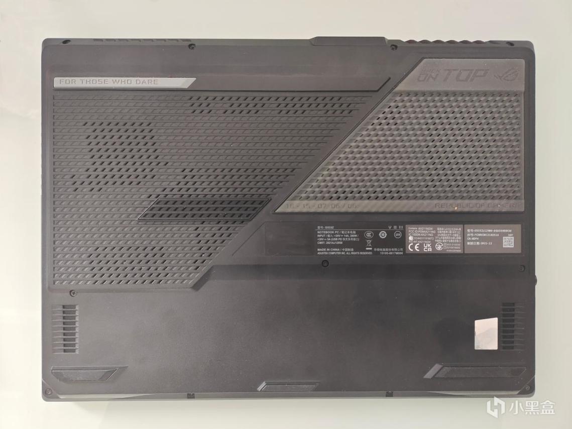 D面其实是最有ROG设计色彩的地方,同样采取不对称斜切设计。脚垫印有“FOR THOSE WHO DARE”等字样。风扇位置也有对应开口,且开口很大。