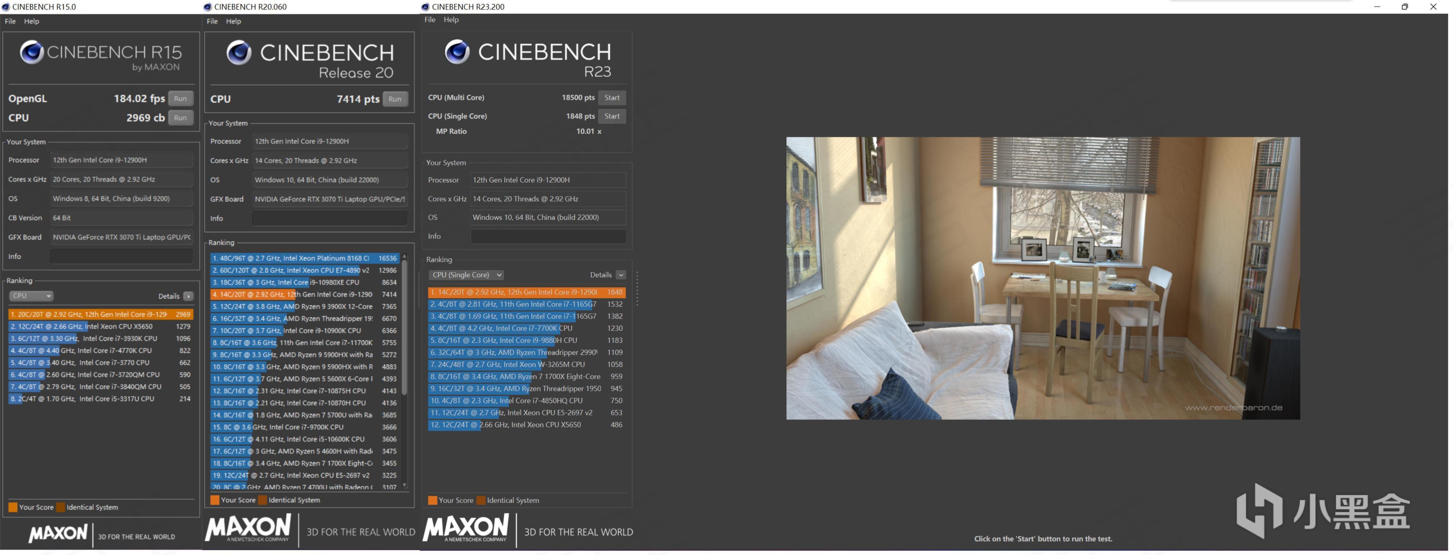 在R15的Open GL渲染有184.02帧。 CPU得分2969CB。在R20中7414PTS的得分。在R23中, CPU有18500PTS的多核。1848PTS的单核。