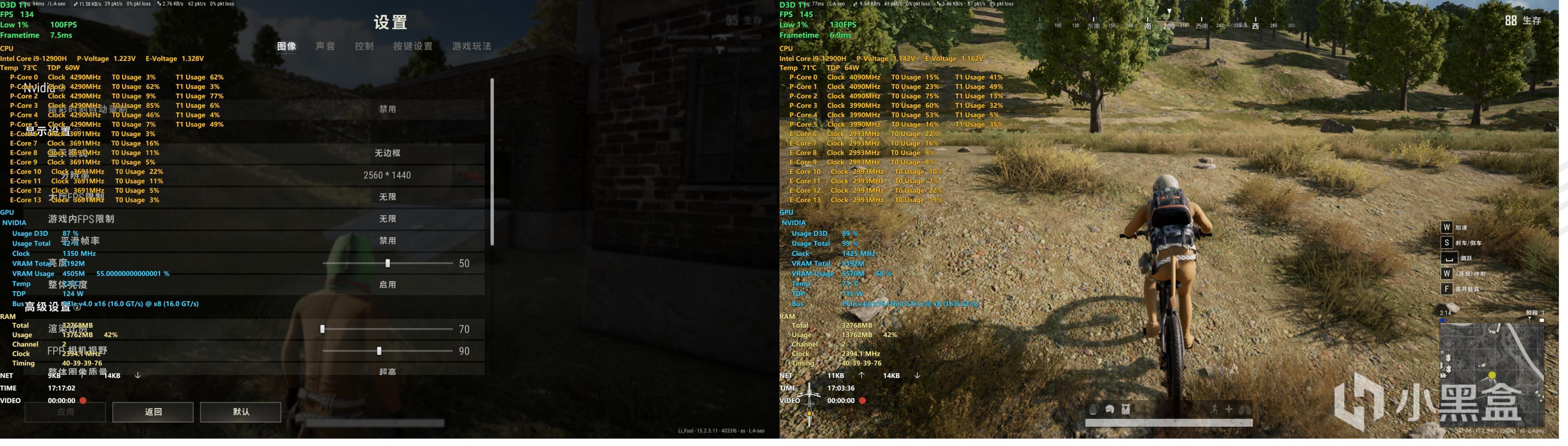70%渲染比例的情况下,野外骑自行车的帧数为145帧。