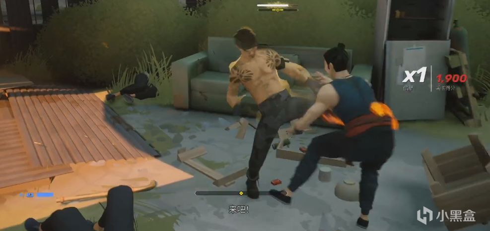 伴随着Howie Lee用中国传统乐器制作,带有电子和敲锣声武术风格具有年代感的音乐,我们来到城市的郊区,醒来后旁边是刻有中文字门匾的“美香包子铺”,翻过铁丝网来到废旧的贫民窟大楼,门前是两个杂兵,轻松平A接处决干掉敌人,处决时连续的拳击让人想起战神处决动作的暴力美学。