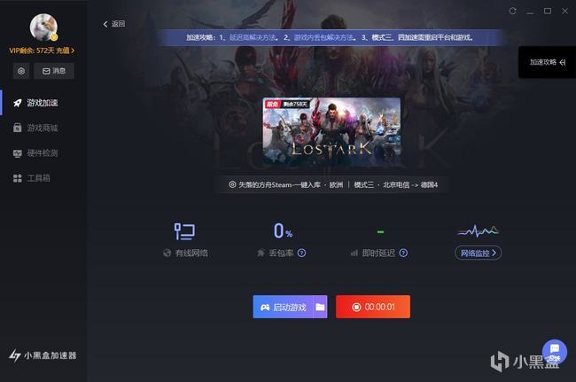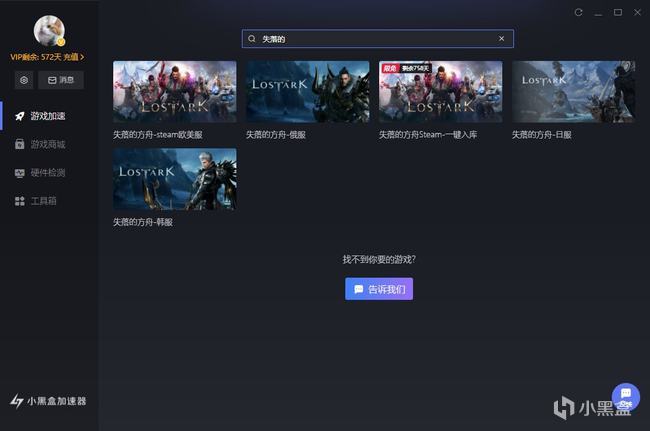2.登录小黑盒加速器,搜索失落的方舟,找到《失落的方舟(Lost Ark)》一键入库加速项。点击加速前需要将Steam先退出,再进行加速。