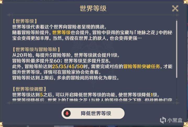 (1)千万不要卡世界等级,游戏里所有资源的掉落都和世界等级挂钩。世界等级越高,掉落的资源等级越好。卡世界等级只会造成角色不能突破、高级素材和圣遗物不能获取等情况,玩家上限被锁死。而探险经验仍旧不断增加,日积月累。一旦恢复正常水平,大世界小怪都将成为噩梦。