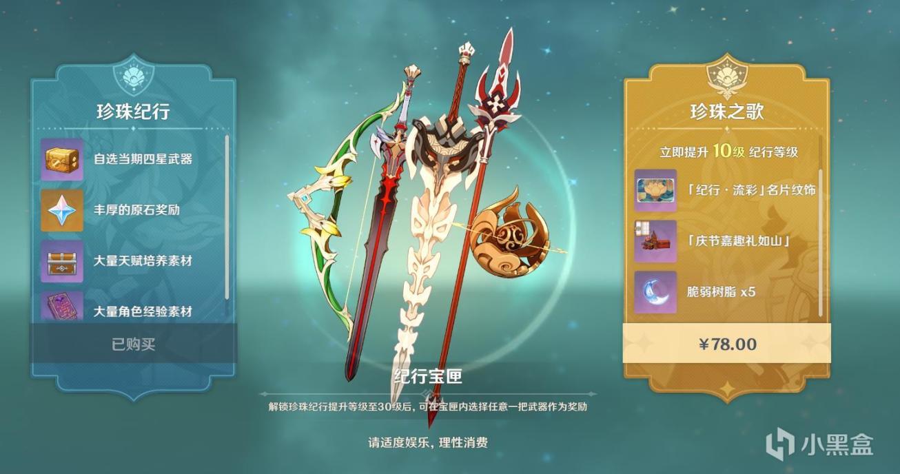 珍珠纪行:69r购买解锁,新增大量的各种素材、天赋书、脆弱树脂(60体力)、一把四星纪行武器(五种类型武器任选其一,属性效果不错)和680原石。该档次性价比尚可,有条件可以购买。