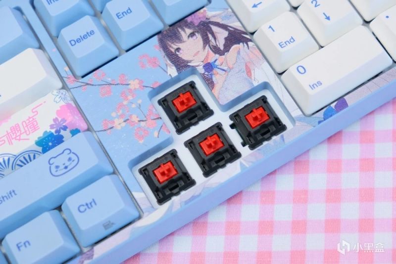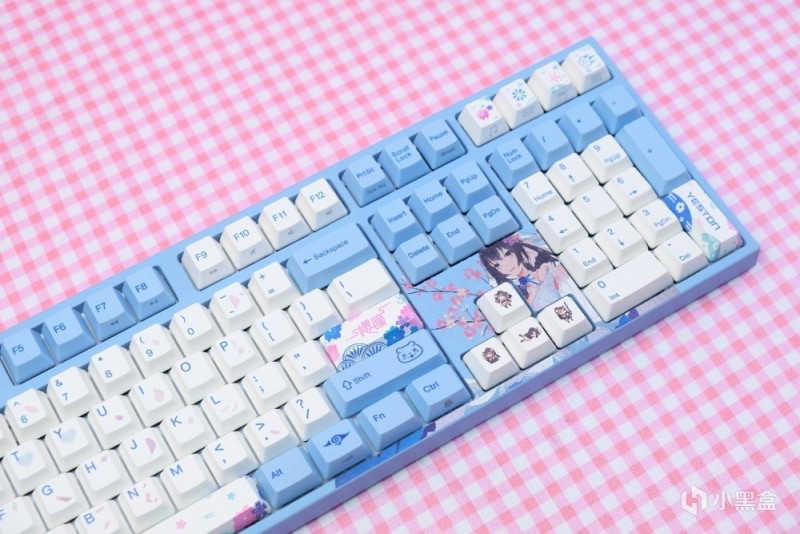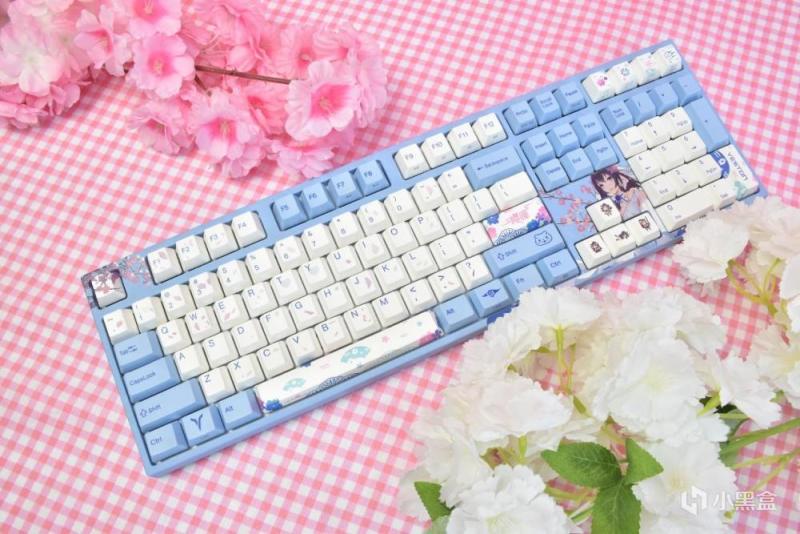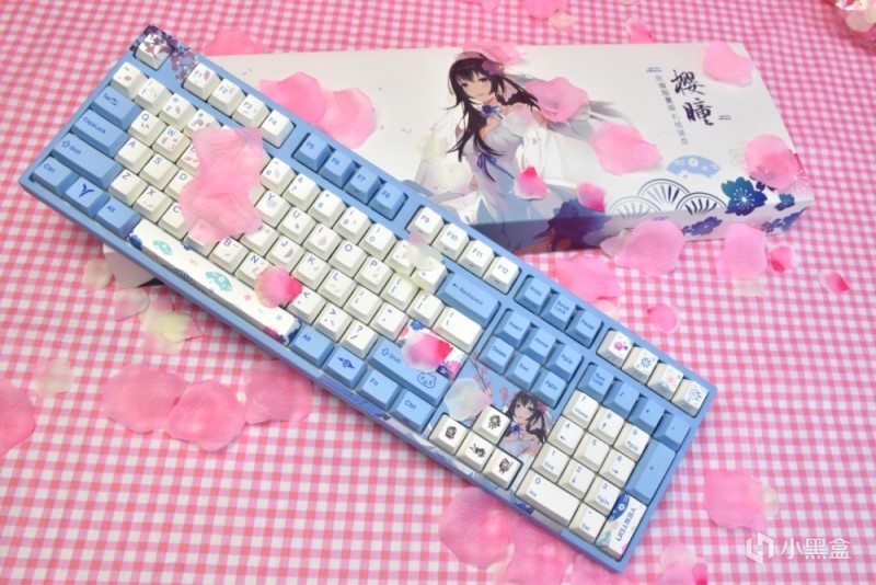 键盘整体以蓝色和白色为主色调,非常匹配樱瞳的形象,清纯又俏皮。PBT材质键帽上点缀的粉色樱花元素印花浪漫唯美,与还有方向键区的樱瞳元素真的够萌够可爱,仿佛能感受到从樱瞳身上散发出若隐若现的樱花香味,大概这就是情人节的味道啊~