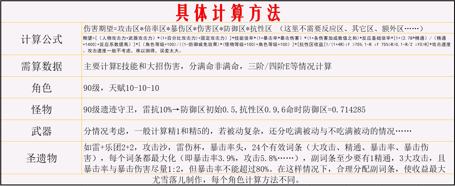 伤害期望=攻击区*倍率区*(1+暴击率*暴击伤害)*伤害区*防御区*抗性区,为了保证数据准确性与直观性,我采用手算与机算相结合的方法,具体算法如图所示: