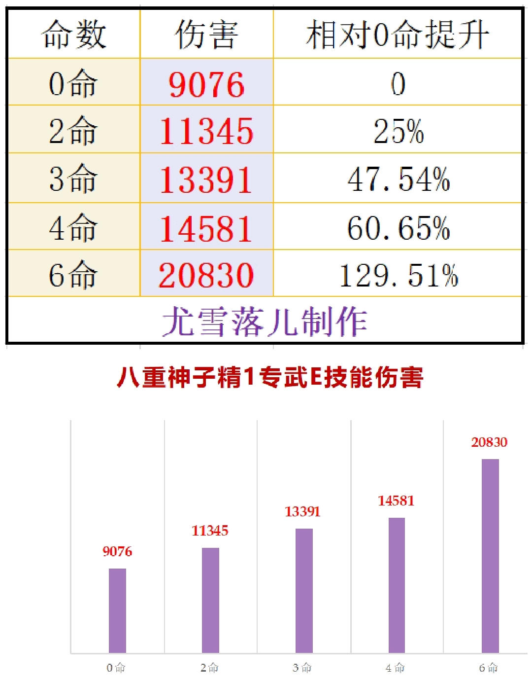 6命时,E技能伤害27244,相当于精1,提升了31%,每精炼一次,伤害提升7.8%左右。结合前面内容,我们可以得出一个重要结论:命之座提升大于专武精炼。