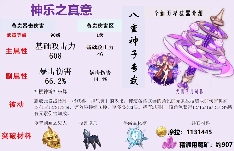 这篇文章只给大家带来专武的伤害期望。如图,八重神子专武叫神乐之真意,基础攻击力608,副词条66.2%暴击伤害。